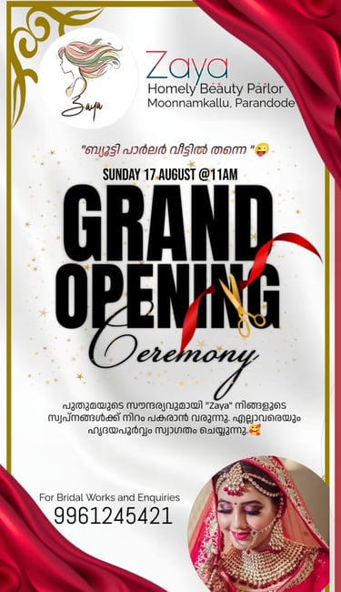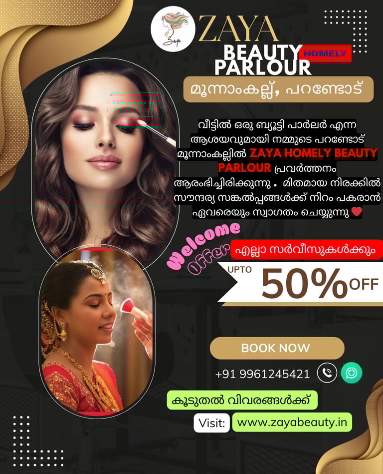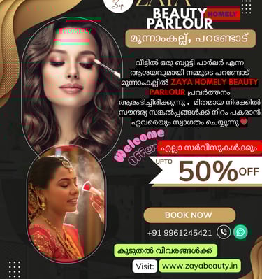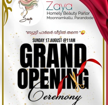 Zaya is a cozy beauty parlour for ladies, located in Moonnamkallu Parandode, dedicated to enhancing your beauty and relaxation.